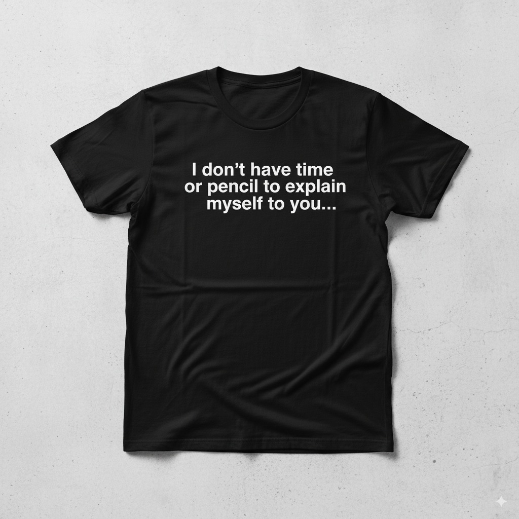 I don't have time or pencil to explain myself to you 15,00 € Desconto de %. Partilhar Tamanho S M L XL Cor Branco Preto Comprar Contactar SKU: YA001 Para quando te apetece explicar… mas depois lembras-te que não tens tempo (nem paciência 😏✏️). A t-shirt ideal para quem já não perde energia com gente difícil. Marca Ya Pois Características