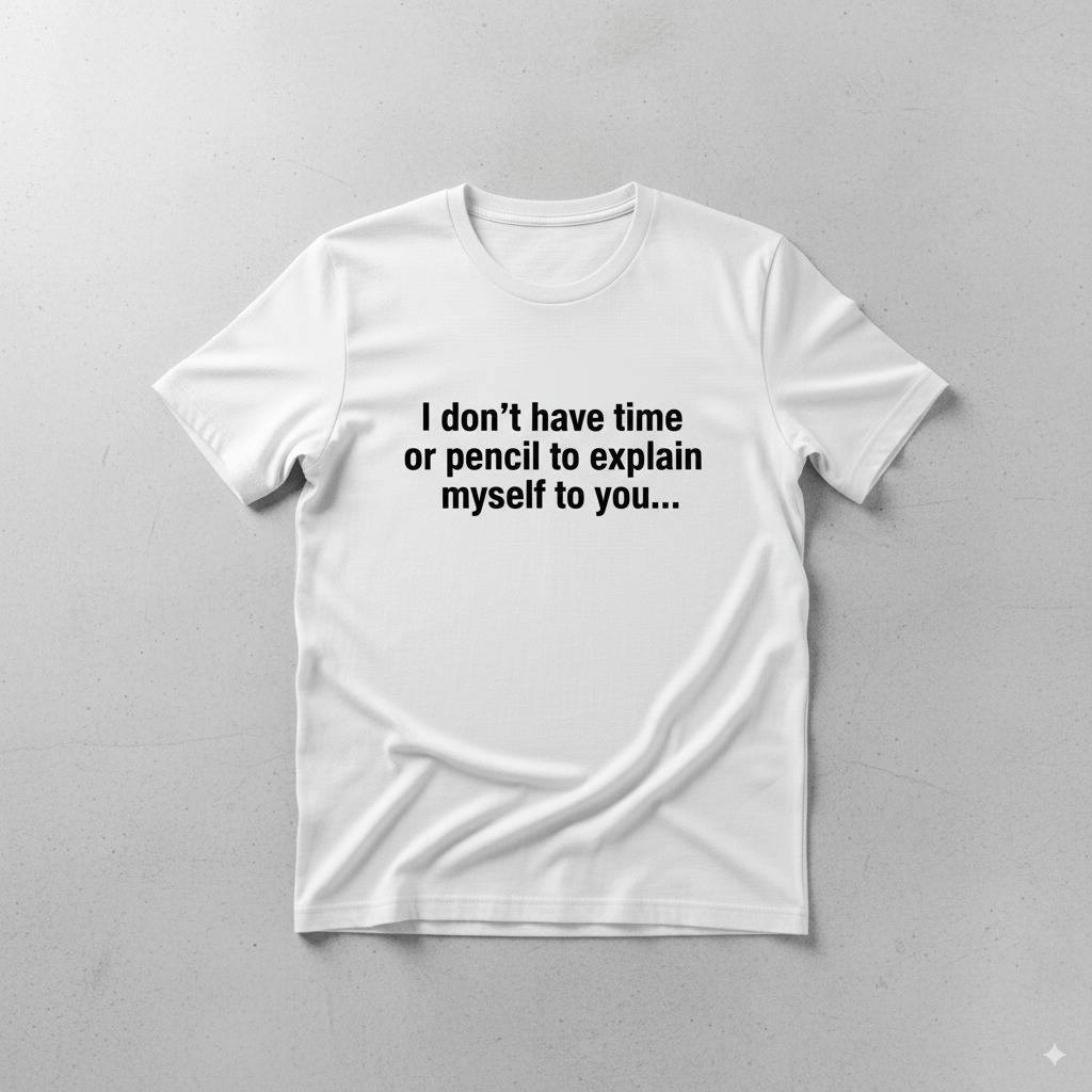 I don't have time or pencil to explain myself to you 20,00 € Desconto de %. Partilhar Tamanho S M L XL Cor Branco Preto Comprar Contactar SKU: YA001 Para quando te apetece explicar… mas depois lembras-te que não tens tempo (nem paciência 😏✏️). A t-shirt ideal para quem já não perde energia com gente difícil. Marca Ya Pois